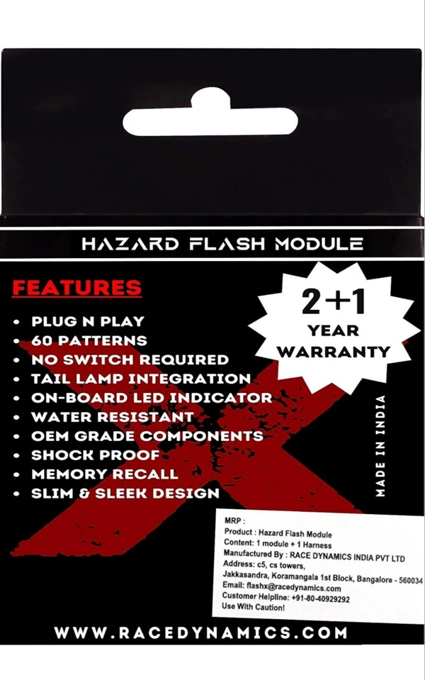 Flash X is a cool hazard flash module for your motorcycle which is a plug and play device that allows you to choose different combination of blink patterns on your motorcycle. Stop worrying about cutting and splicing of wires as this one just plugs into the stock socket of your motorcycle. Too many switches on your handle bar and no more space to mount another ? problem solved !! We have integrated it with stock indicator switches of your motorcycle with just the combination of right, left, right and center clicks