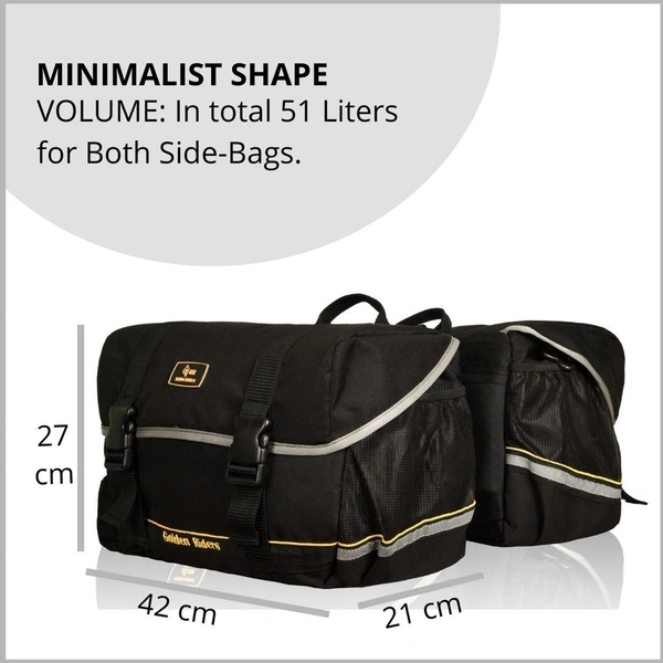 - Volume - 51+ Litres, 26 Litres per side bag.