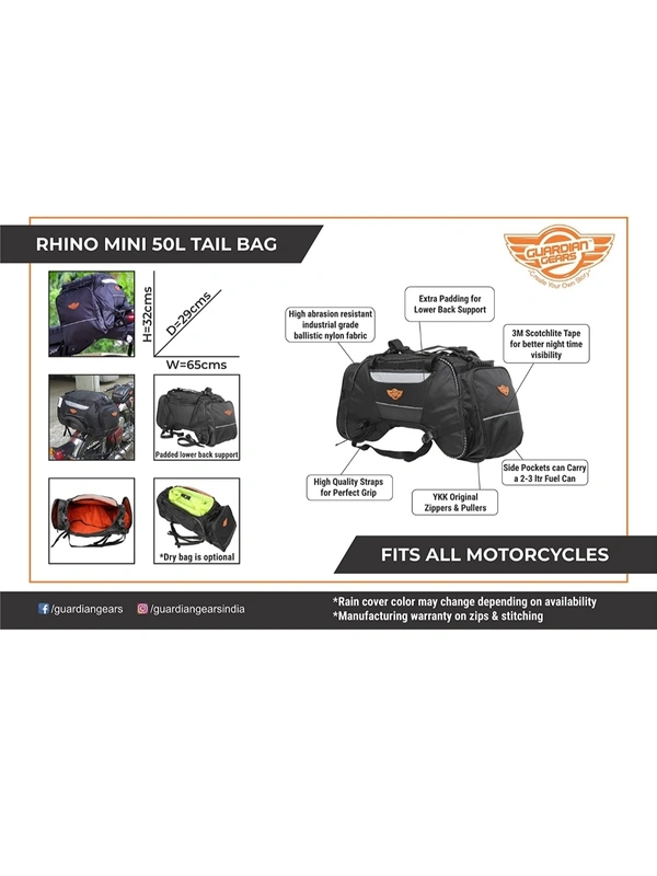 Rhino Mini 50L Tail Bag with Rain Cover fits on ALL Motorcycles from 100CC to 1000CC - Plastic, Polyester and Nylon
