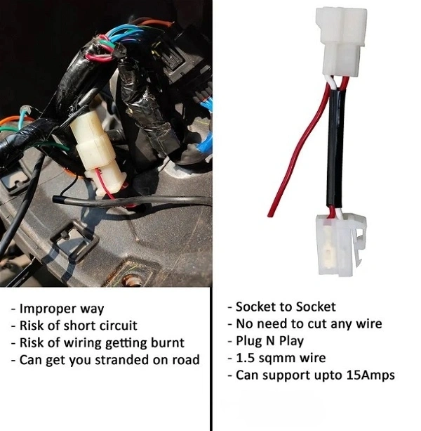 Easy way to take parallel connection from Ignition for any extra electrical accessories. Works for all new models of Royal Enfield and KTM Bikes.